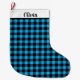 This Christmas stocking is shown in a black and blue color buffalo plaid print.