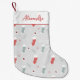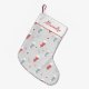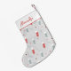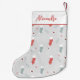 This cute Christmas stocking features a pattern of red and grey Christmas stockings, pine tree sprigs and snowflakes, on a light grey background. Click "Personalize this Template" to easily change the featured sample name.