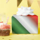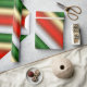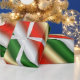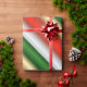A colourful Christmas wrapping paper with diagonal stripes in the traditional Christmas colours of red, green and white.