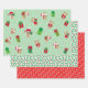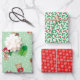 Set of 3 colourful, festive Christmas wrapping paper sheets. Pale green background with white stars all over and a variety of adorable teddy bears and Christmas gifts scattered around. Another is red with white snowflakes and the other is holly leaves and berries.