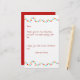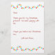 Christmas thank you note from kids with “fill in the blanks” design. White with red, printed text, this stationery is decorated with a string of lights at top and bottom. The child can fill in the “Dear - name” and the name of the gift, and his or her name as the signature. Reverse is solid red.