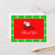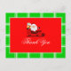 This postcard features a picture of Santa Claus in his sleigh while waving. The words "Thank you!" are written in a script font. The border is a festive green with a bright red background. This is the perfect way to send your Christmas thanks to your family and friends.