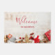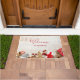 Welcome doormat with a rustic photograph. A light brown wooden board with various Christmas elements along the bottom.