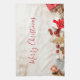 A kitchen towel with a rustic photograph. A light brown wooden board with various Christmas elements along the bottom.