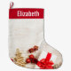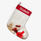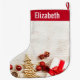 Christmas stocking personalized with a name. A rustic photograph. A light brown wooden board with various Christmas elements along the bottom.