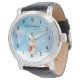 Modern watch with a cute snowman illustration. He is wearing a black stovepipe hat, holding a classic corn cob pipe, and wearing a red scarf. Standing in the cold white snow smiling and waving hello. The background is composed of a watercolor sky with blue and purple colours blending and mingling together. Customizable text says Christmas Time.
