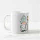 Whimsical tomte style gnome in blue garb with festively illustrated Christmas text on light grey background