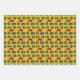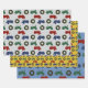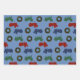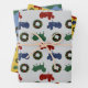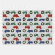 Christmas wrapping paper sheets with a farm theme. Red, green and blue tractor images, and holiday wreaths make up this pattern. Each sheet has a different background colour, including light grey, gold yellow and blue. Perfect for wrapping Christmas gifts for any farmer.