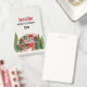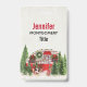 A name tag with a cute and whimsical Christmas theme. A cozy trailer decorated for Christmas set among some pine trees.