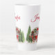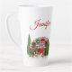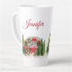 A latte mug with a cute and whimsical Christmas theme. A cozy trailer decorated for Christmas set among some pine trees. Personalize with a name or other text.