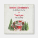 Christmas party thank you magnet with a cute and whimsical Christmas theme. A cozy trailer decorated for Christmas set among some pine trees.