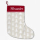 Add an elegant modern double sided holiday stocking to your mantel featuring a geometric pattern of white Christmas trees in varying sizes on a beige background with faux texture. Add your name in the sidebar. It will appear in white script text over a burgundy band at the top on each side.