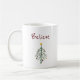 Christmas Tree Believe coffee mug, with a festive red and green holiday tree and a cute red typography design. With customizable lettering, you can add your own text. Makes a festive gift or for celebrating this holiday season with your favourite hot beverage