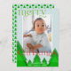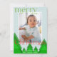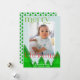 Simple modern Christmas Card with a single photo framed in a white border on a pale ice blue background. A forest of geometric trees with blended shades of green adds a unique detail. A bright green and red "merry Christmas" in a shapely font with a few festive flourishes. Personalize with a brief message and your names, and the year. The back of the card features a tree pattern in a matching colour scheme.