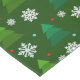 A lush forest of green spruce trees with snow and red and blue dots creates a serene and magical atmosphere. Fluttering among the trees are delicate snowflakes, sparkling in light blue and grey. Subtle holiday touch is added with bursts of vibrant colour in the form of red and blue dots, reminiscent of cheerful ornaments adorning a Christmas tree. These dots add a playful contrast against the snowy landscape, evoking feelings of joy and festivity. The pattern captures the essence of the holiday season, combining the natural beauty of winter with the warmth and cheer of Christmas celebrations.