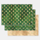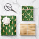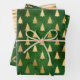 This holiday wrapping paper assortment features patterns of gold faux foil Christmas trees and holly sprigs on green distressed backgrounds, along with a gold faux foil satin stripe pattern.