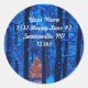 Bright colourful Christmas tree in the dark, blue-tone evening forest. Text in white.