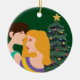 Beautiful lesbian Christmas ornament featuring a romantic gay couple. Two women hold each other in a loving embrace in front of a festive Christmas tree on a pretty ornament gift for your LGBT friends