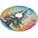 The image is a painting of a vibrant, multi-coloured Christmas tree, adorned with a white star at its top. It contains colourful stripes and splatters including bright shades of blue, red, orange, and yellow. The tree is set against a light blue background, further adding depth and colour to the scene. Overall, the image conveys a joyful and festive holiday atmosphere.