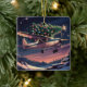 A funny vintage style Christmas ornament with a Cessna 172 airplane flying through a star-filled sky, with a fully decorated Christmas tree strapped to its top. Set against rich indigo and amethyst hues with illuminated snowdrifts below. The back offers space for a personal message and a cute family photo evoking cozy nostalgia and joyful adventure, perfect for sharing holiday warmth and magic.