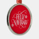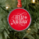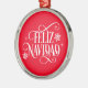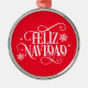 This Christmas tree ornament is shown in a round shape with festive holiday Feliz Navidad snowflakes print.