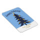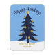 Cute cartoon dark blue evergreen tree with a gold star and simulated glitter circular ball ornaments. The tree is surrounded by a bright blue sky and white falling snowflakes. The tree is on a white snowbank. Happy holidays in blue font and a second line in dark golden yellow/brown font can be customized with your own message.