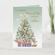 Christmas tree with a lot of decorations and presents set against a pale green background with sparkling stars. A Gorgeous Christmas card for Parents. You can adjust text according to your requirements.