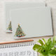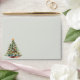 Sage green background. Personalize and add a name and your return address. The name is written with a modern and trendy handlettered style script. Decorated with a watercolored Christmas tree.