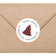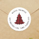This design features a Christmas holiday return address label, a simple minimalist minimal style, with a Christmas tree buffalo plaid check, a winter red and black check, a stylish trendy modern typography, a classic traditional Christmas stickers, a winter country farmhouse creative, a circle round text font lettering, a Christmas holiday mailing supplies, a Christmas holiday tree illustration