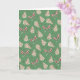 These customizable Christmas cards feature a pattern of white christmas tree snack cakes, red and white striped peppermint bows, and little red stars against a moss green background.