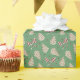 This Christmas gift wrap features a pattern of white christmas tree snack cakes, red and white striped peppermint bows, and little red stars against a moss green background.