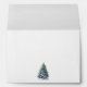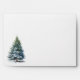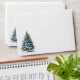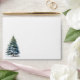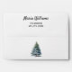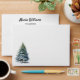 White background. Personalize and add a name and your return address. The name is written with a modern and trendy handlettered style script. Decorated with a watercolored pine tree with snow.