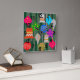 This wall clock has a design that looks like ornaments in red, green, blue, pink, gold, silver, and white on a Christmas tree.