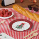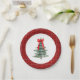 Christmas Eve party plates with Christmas tree and red bow and plaid.