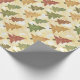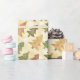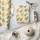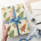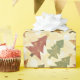 Cheerful festive wrapping paper with a Christmas tree pattern. Colours are soft greens and browns.