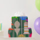 This wrapping paper has a design that looks like ornaments in red, green, blue, pink, gold, silver, and white on a Christmas tree.