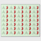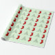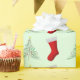This wrapping paper design features decorated Christmas trees and red Christmas stockings, on a light green background.