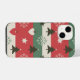 A seamless pattern of a Christmas scene with a snowy landscape. There are Christmas trees with ornaments and a star on top, Santa Claus, a sleigh, and presents. There are also houses with smoke coming out of the chimneys. The ground is covered with snow. The background contains mountains. The overall pattern has a warm and cozy atmosphere. Less