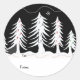 An elegant gift tag in black and white featuring whimical snow covered trees on a black background.