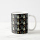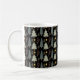 Winter will be cozy with this modern patterned coffee mug. It has assorted winter trees in green on a black background, with branches and yellow stars fscattered throughout. A great mug to use for Christmas and all winter long. /cao/c