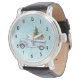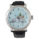 A watch with a festive holiday design. A truck carrying Christmas pine trees along with some woodland animals. A bear a fox and a deer standing in the back going for a ride. Design created with watercolors.