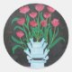Original oil painting by artist Susan Payne-Trutna of red Christmas Tulips in a Tulipiere on a pink and white check tablecloth. Of course the tulip stickers will make your envelopes bloom anytime of the year!