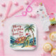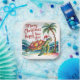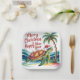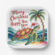 A whimsical Christmas greeting card featuring a cheerful watercolor illustration of a sea turtle sporting a festive Santa hat and adorned with twinkling Christmas lights strung around its shell, set against a backdrop of a swaying palm tree also illuminated with warm lights and a serene turquoise ocean. The turtle's shell is painted with intricate patterns of tropical flowers in soft pastel hues of coral, lavender, and seafoam green, while the ocean shimmers with subtle gradients of blue and silver, creating a peaceful yet celebratory atmosphere. "MERRY CHRISTMAS & HAPPY NEW YEAR" appears in a playful, hand-lettered font across the top of the card, with the interior offering a clean white space for a personalized message and a subtle, repeating pattern of small seashells along the bottom edge to reinforce the tropical theme. The overall tone is lighthearted and joyful, perfect for sending warm wishes to friends and family during the holiday season.