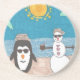 A snowman and a penguin take a vacation to the beach.