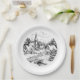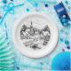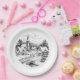 These elegant black-and-white Christmas plates feature a beautifully illustrated winter village, evoking the quiet charm of a storybook scene. Delicate linework captures snow-covered rooftops, pine trees, and a winding stream beneath a stone bridge, all bathed in a soft, vintage glow. A slender church steeple watches over cozy cottages, while distant mountains fade into a dreamy horizon. The design is airy and serene, inviting warmth and nostalgia. At the right of the illustration, you can personalize the “Merry Christmas” message.