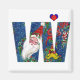 W bold alphabet letter Xmas initial design with heart. Colourful, whimsical and artistic acrylic painting for Christmas. Santa Claus ,snowy Winter night with floral ornaments,red ribbons , bow,green decorative plants,red ribbons, holly berries,cat and toys in the snow by Bulgan Lumini (c)