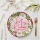Personalized large paper plates feature modern, elegant winter flowers and a pink poinsettia with Merry Christmas and your name in chic lettering. MATCHING items in our store.