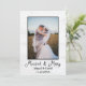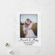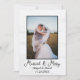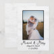 Bride and groom wedding photo in a thin black frame on a faded white background with a paint texture.