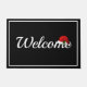 Doormat shown in black and white with a holiday santa hat and white trim.