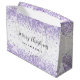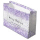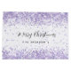A stylish whitebackground decorated with violet, lavender coloured faux confetti, sparkles. Personalize and add your family name. Text: Merry Christmas.